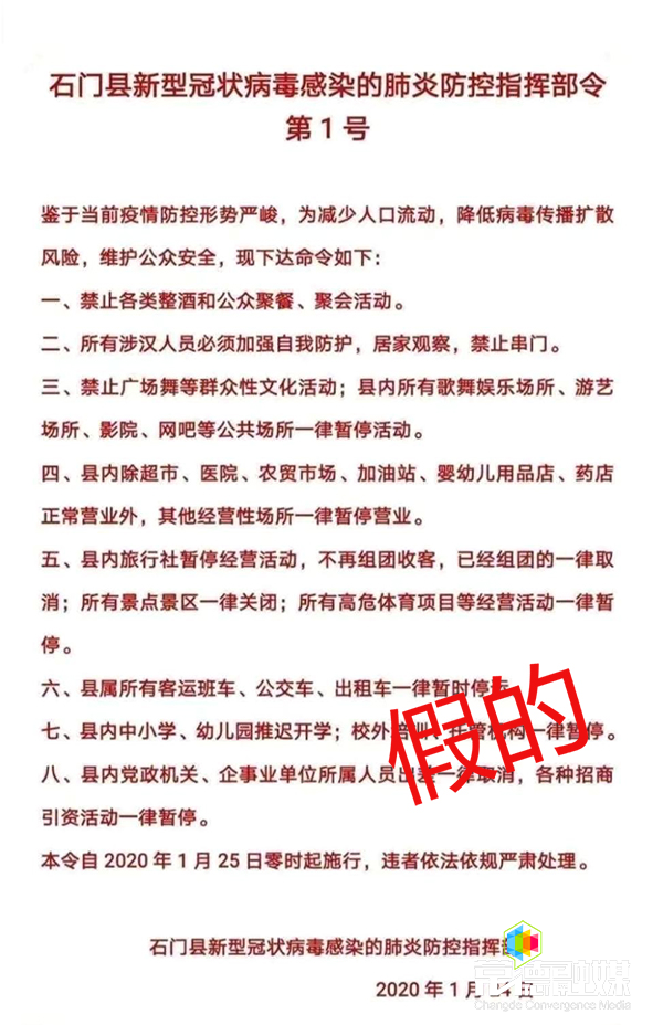 1月25日10時許,石門縣公安局網監大隊民警在網絡巡查工作中發現,一份名為《石門縣新型冠狀病毒感染的肺炎防控指揮部令第1號》的文件在該縣多個微信群和朋友圈流傳,經辦案民警與石門縣政府工作人員核實,流傳文件為不實信息。