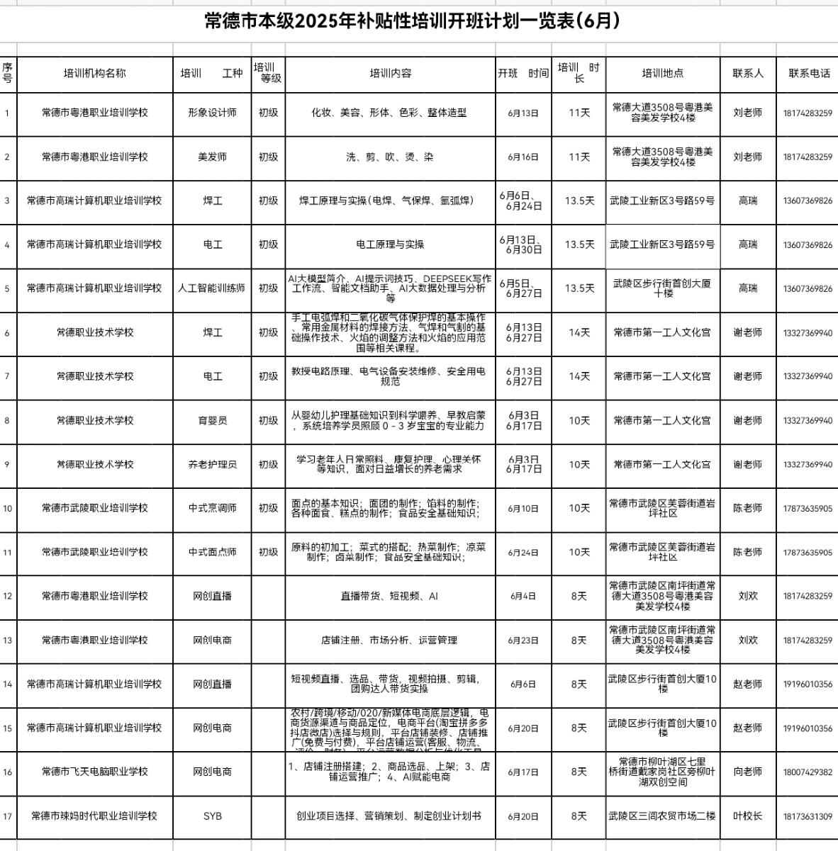 附:常德市本級2025年補貼性培訓開班計劃一覽表(6月)