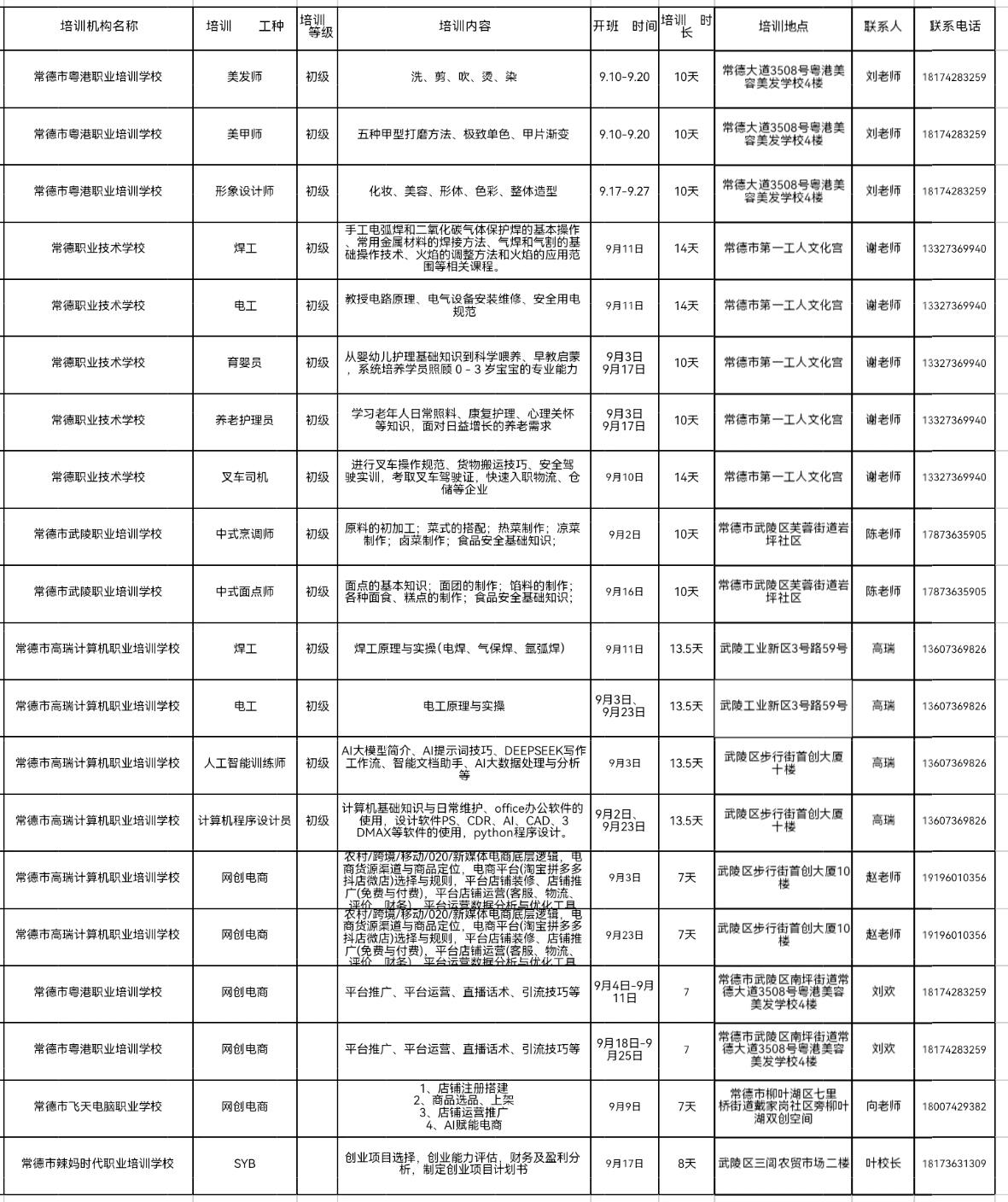 附:常德市本級2025年9月補貼性培訓開班計劃