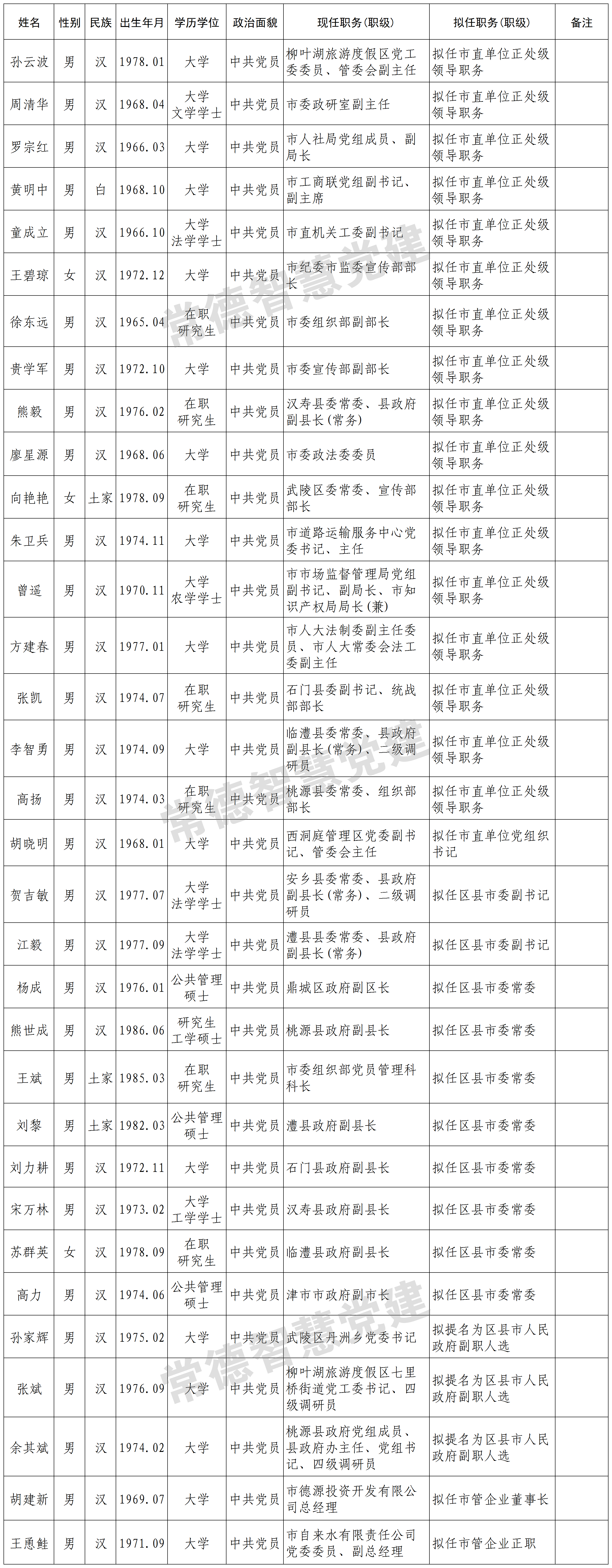 為了加強對干部選拔工作的監(jiān)督,提高識別和任用干部的準確程度,現(xiàn)對市委常委會會議研究決定的下列擬任人選(候選人人選、提名人選)進行任前公示: