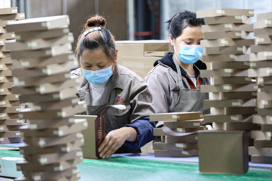 4月22日,湘西經濟開發區三湘印務有限責任公司,工人在有序加工包裝盒。近段時間以來,當地相關部門在做好新冠肺炎疫情防控的同時,積極協調解決資金、招工、物流等問題,扶持扶貧車間全面復工復產,幫助貧困戶穩就業、穩增收。