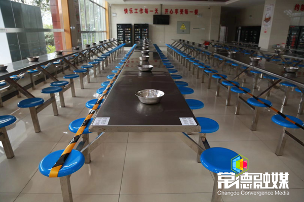 為加強(qiáng)預(yù)防措施,中鋰新材的食堂所有餐桌的一邊座位被膠條封閉