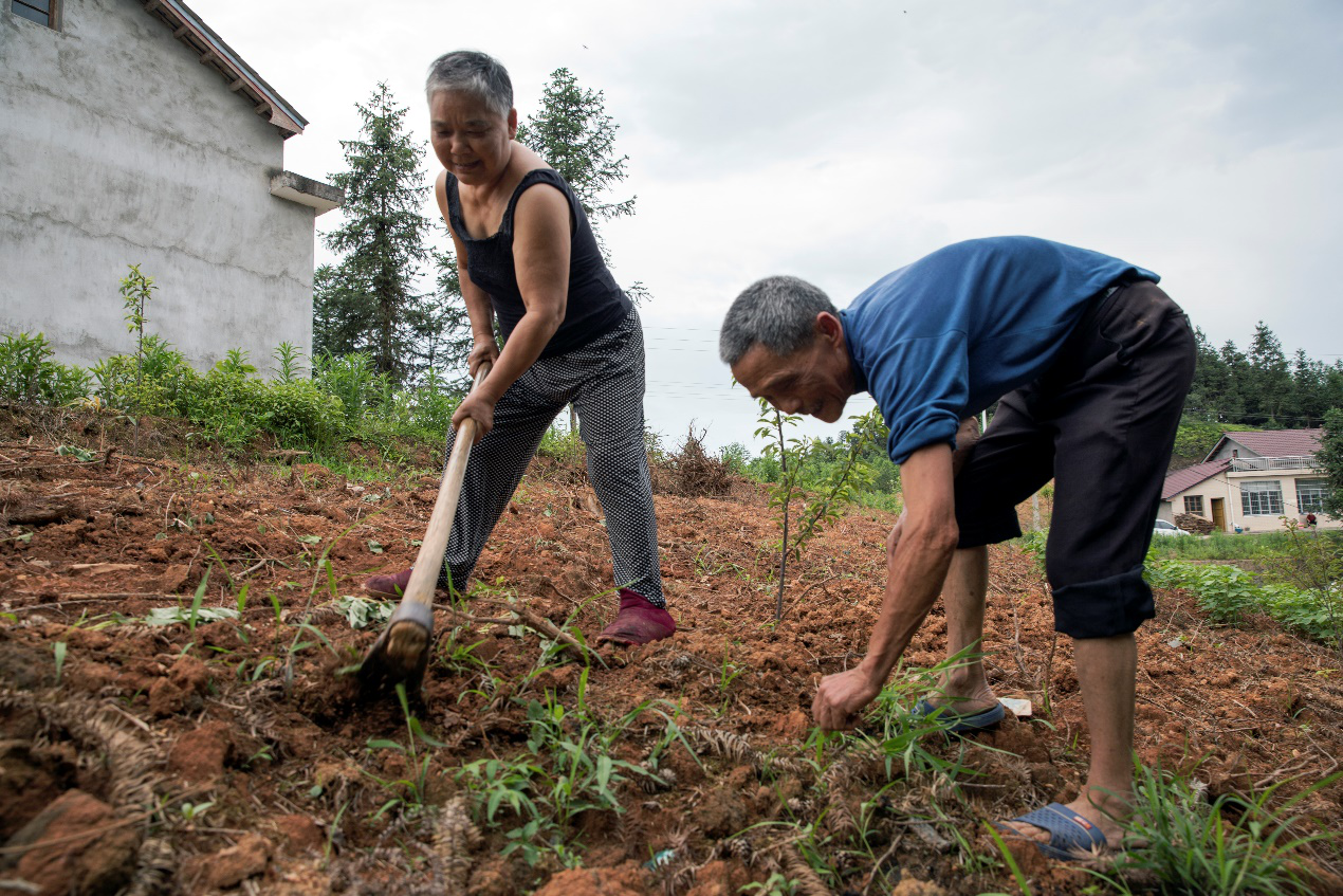 唐松元兩口子在地里忙著給蜂糖李薅草,他家里一共種植了40株蜂糖李,果苗都是村里免費(fèi)送的。唐松元身患慢性腸道疾病,需常年吃藥,妻子賀春梅也體弱多病,2017年被納入建檔立卡貧困戶,在當(dāng)?shù)卣头鲐毟刹康膸椭拢揽咳牍珊献魃纭⒎N果樹,養(yǎng)土雞等,收入逐年增加,老兩口對生活了充滿信心。