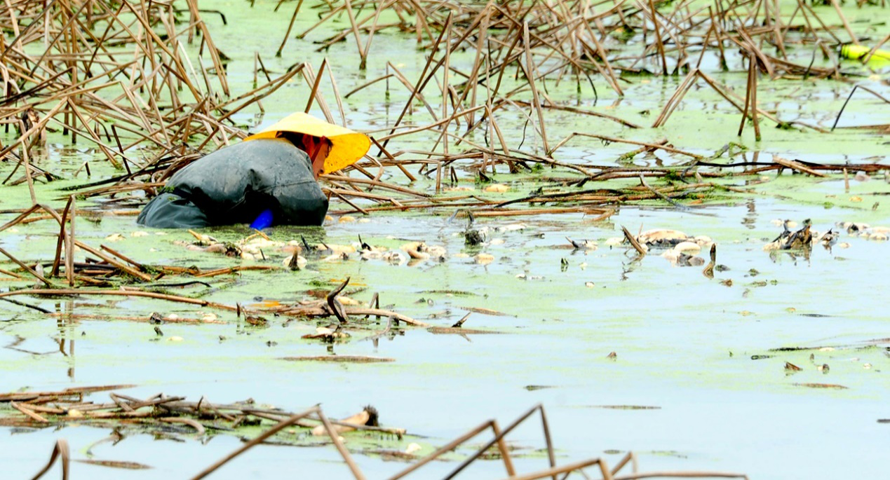蓮藕敲開致富門,荷塘傳來歡笑聲。