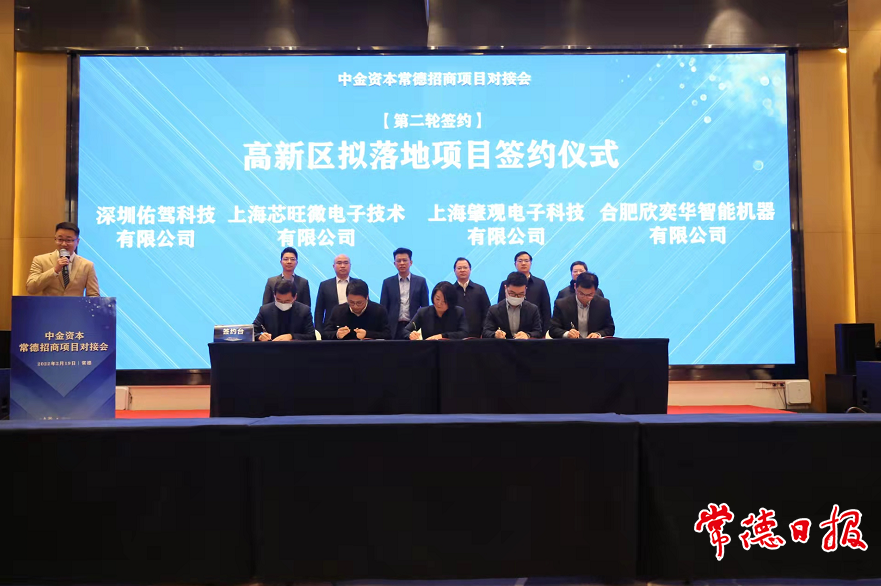 簽約儀式上,湖南申億精密零部件股份有限公司、快電動力(北京)新能源科技有限公司、深圳有為技術控股集團有限公司簽約落地,總投資額3億多元;深圳佑駕科技有限公司等7個項目簽訂合作框架協議。中金常德新興產業基金出資5000萬元,投資湖南新合新生物醫藥有限公司,支持本地產業項目發展。