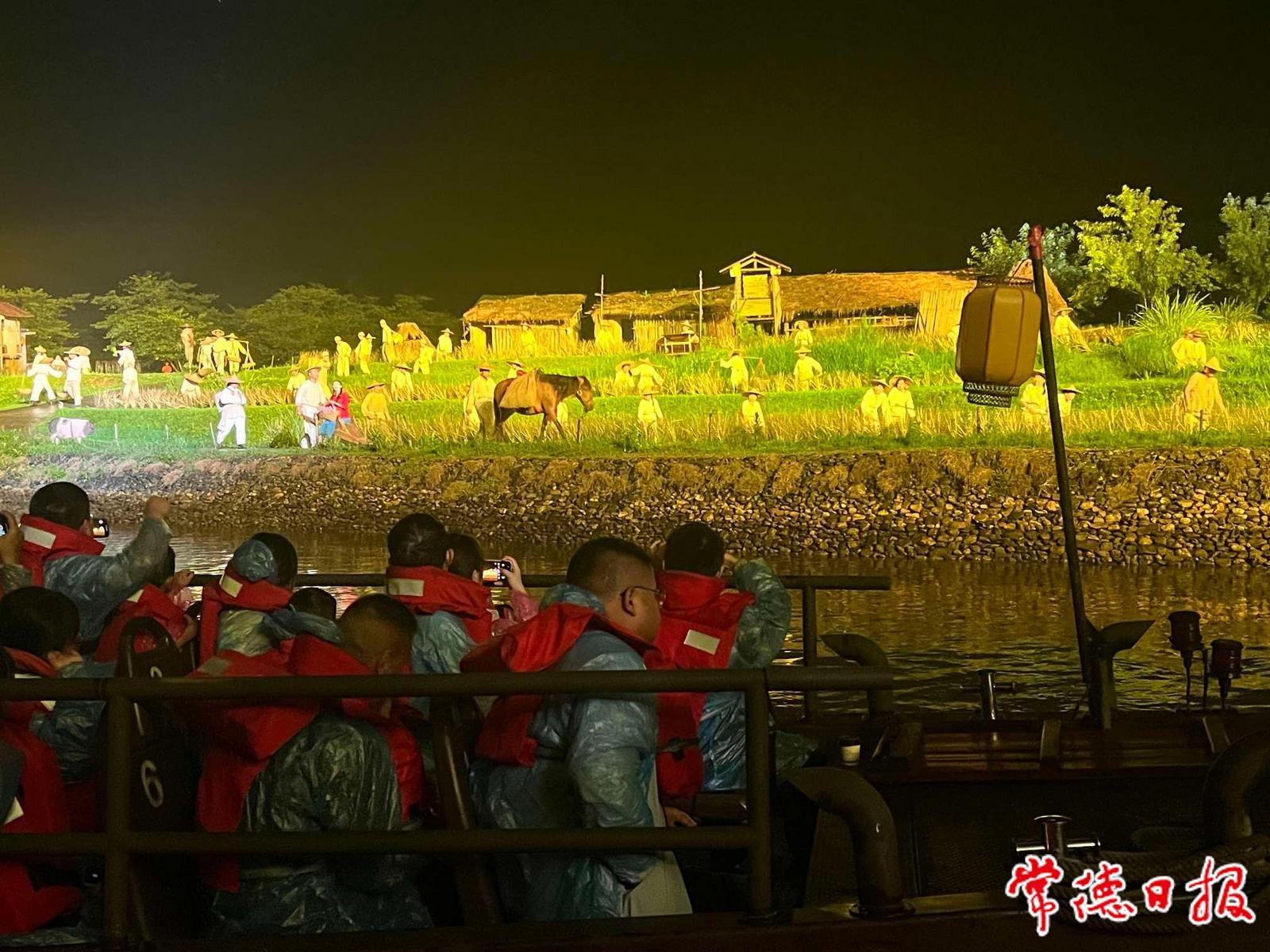 游客乘坐游船觀看大型溪流漫游實(shí)景演出《桃花源記》