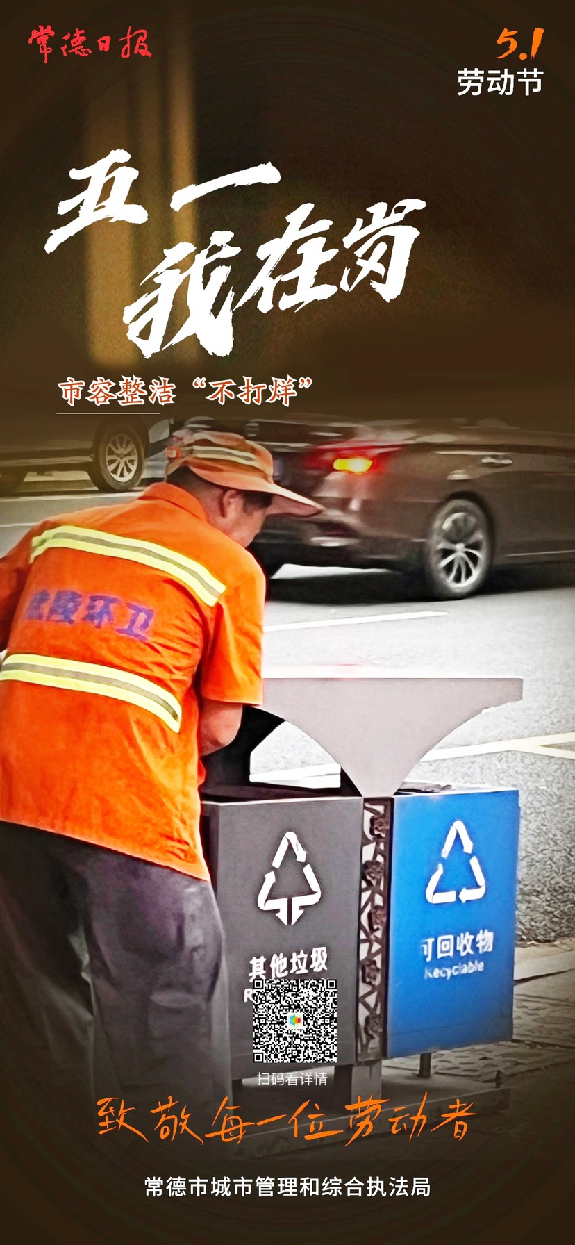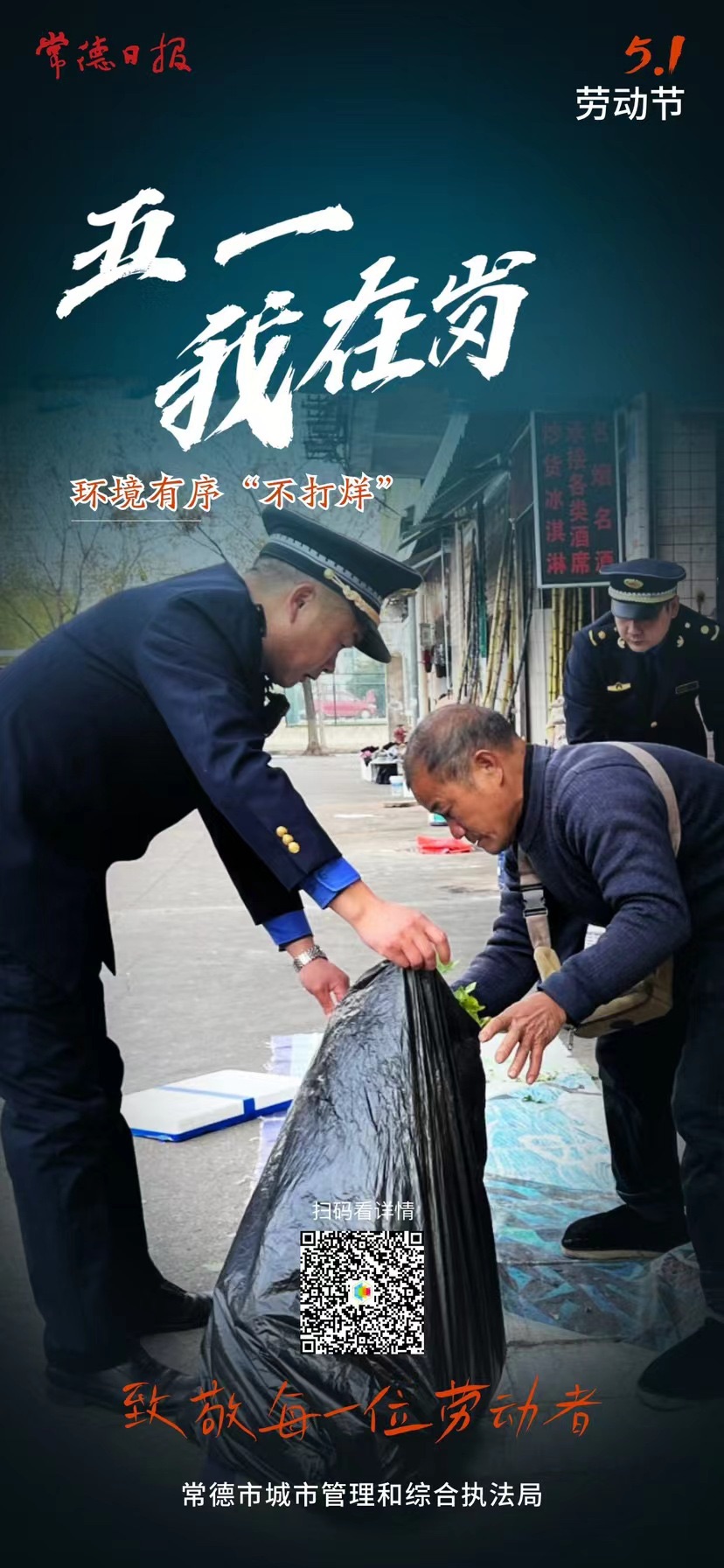 海報|五一我在崗 常德城管人用堅守詮釋“勞動最光榮” 分享到: 打印 字體:小 大 2024-05-06 09:05 來源:常德日報·常德融媒客戶端 作者:伍銀 羅奕芹 點擊次數: 次 “五一”期間,市城管部門強化服務措施,加大巡查力度,精心扮靚城市“顏值”,為廣大市民營造整潔、亮麗、和諧、有序的城市環境。常德城管人用實際行動詮釋了“勞動最光榮”。 終審:陳麗宇 【我要糾錯】 責任編輯:陳麗宇 掃一掃在手機打開當前頁