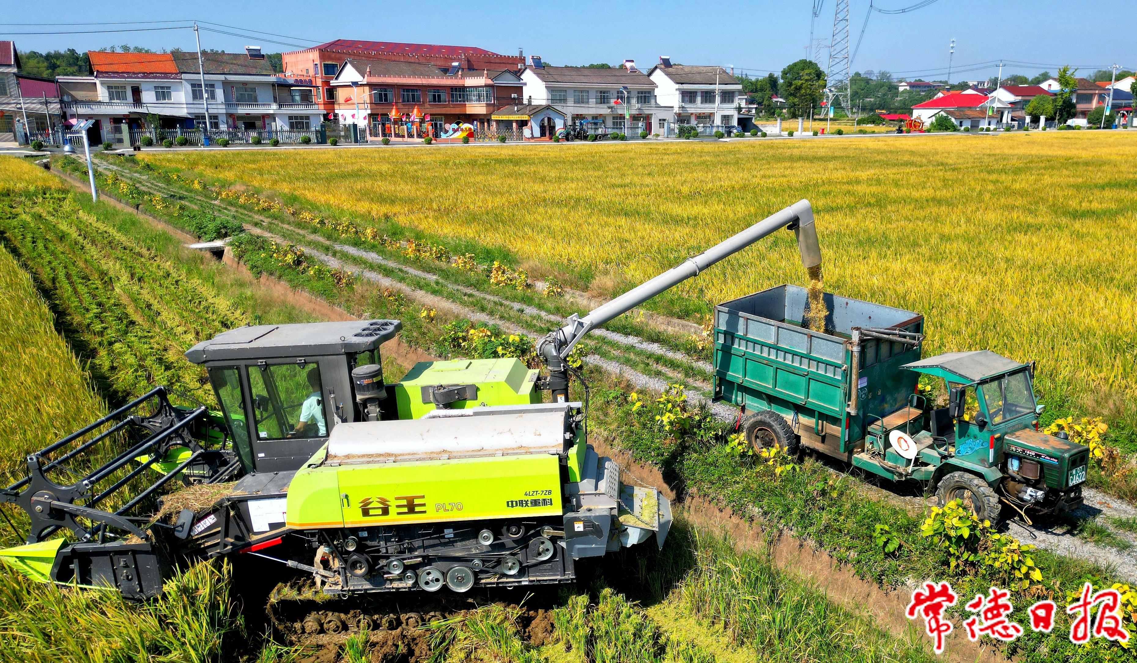 金秋十月,鼎城區的晚稻陸續成熟,一片金黃的豐收盛景。10月24日下午1時許,在謝家鋪鎮糧食生產萬畝綜合示范片,一望無際的稻浪中,傳來陣陣轟鳴農機聲。放眼望去,種糧大戶戴宏和他的父親分別駕駛著大型收割機開足馬力來回穿梭,割穗、脫粒、稻谷裝車等工序一氣呵成。