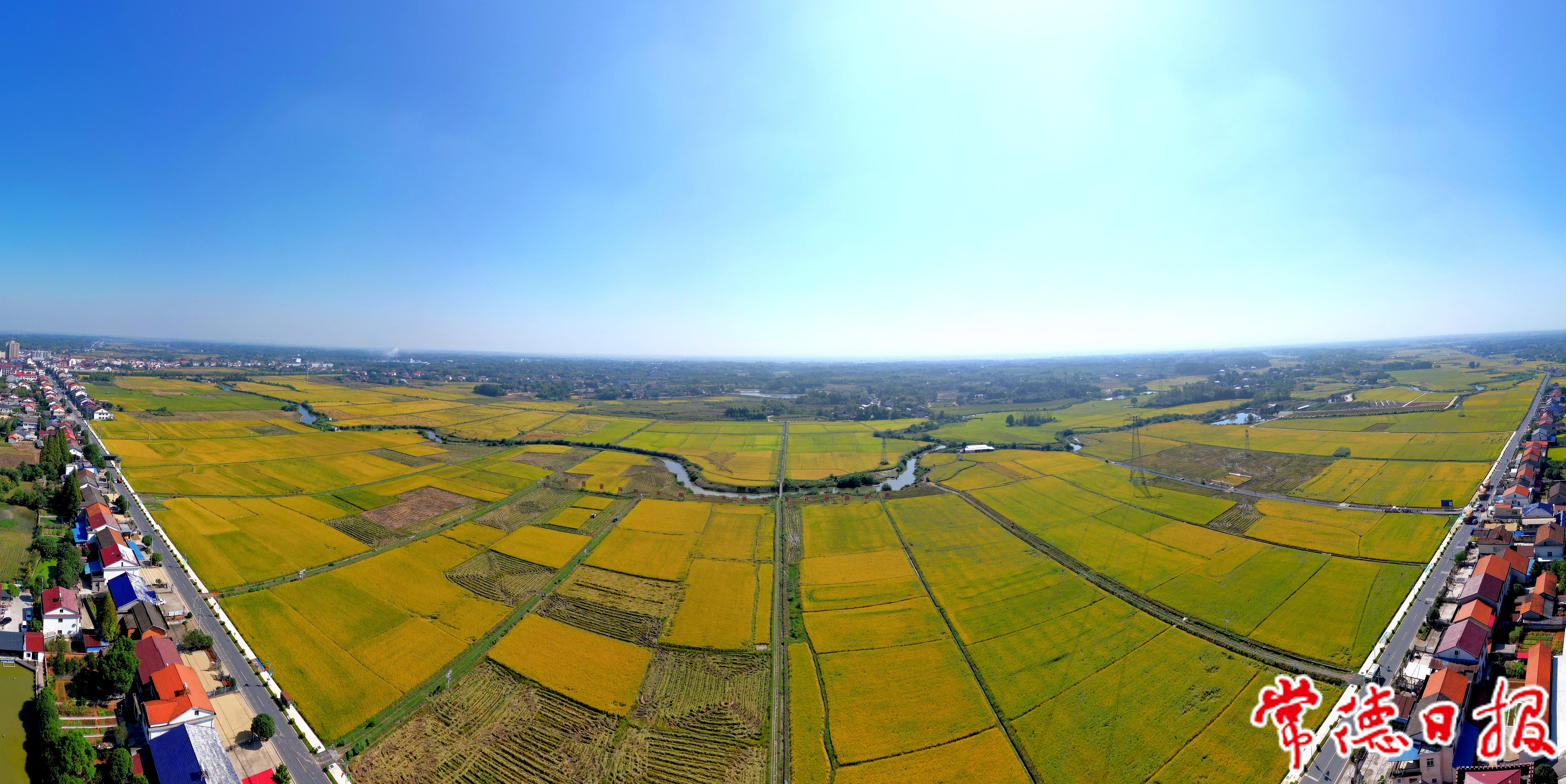 航拍鼎城區謝家鋪鎮糧食生產萬畝綜合示范片的晚稻染黃了大地,處處一派豐收的景象。王明睿 攝