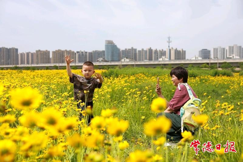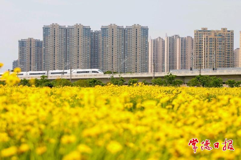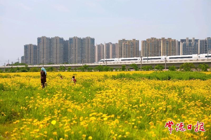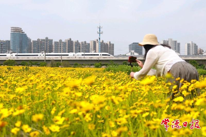 5月6日,在常德市城區(qū)太陽大道泰達(dá)潤景園小區(qū)對面,大片金雞菊燦爛綻放,金黃絢麗的景致美不勝收。呼嘯疾馳的高鐵,從這片“花海”間穿梭而過,引得眾多市民紛紛前來打卡,與高鐵同框。