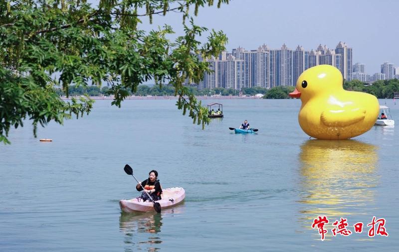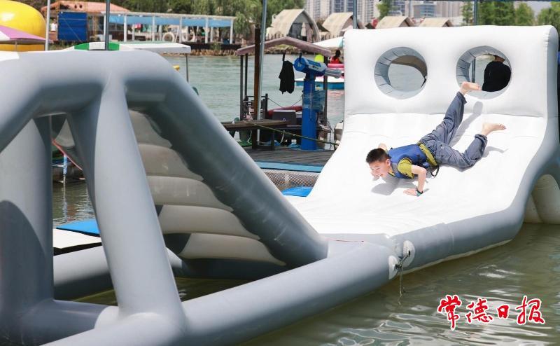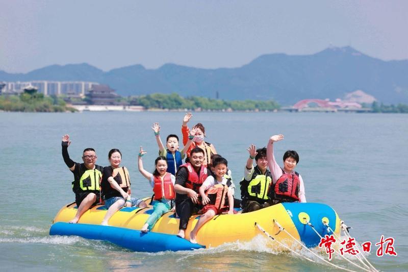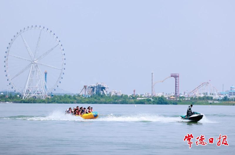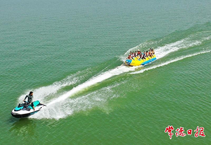 游客乘坐香蕉船在柳葉湖上感受沖浪帶來的樂趣