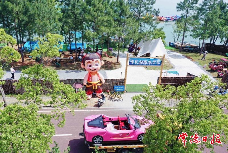 5月1日,位于漁歌藝術(shù)營地的動感水上樂園用哪吒玩偶吸引小朋友的注意,新到的水上跑車準(zhǔn)備卸貨