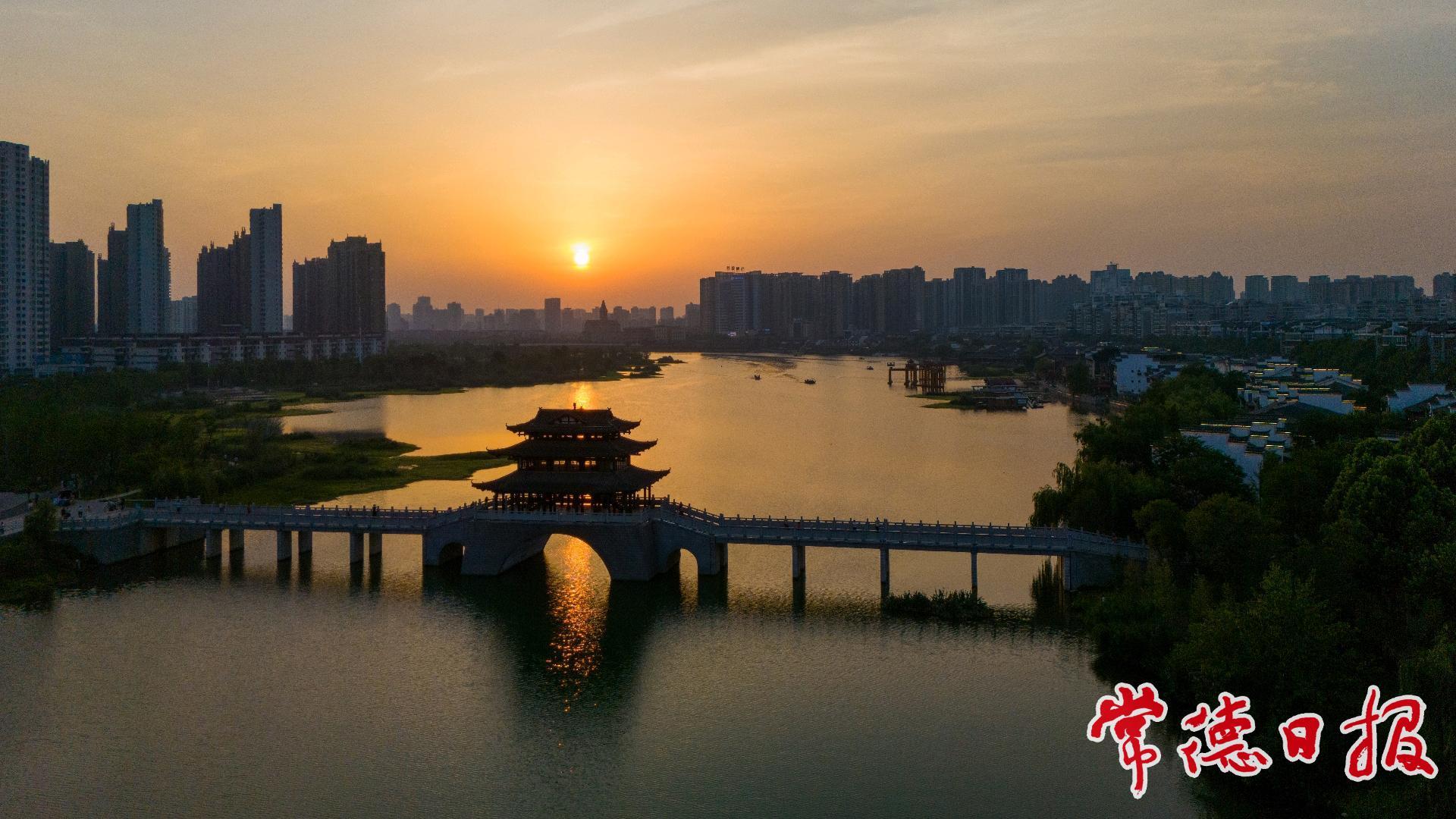 航拍常德河街。落日的余暉傾灑而下,與古樸的橋閣相互輝映。城市的繁華與自然的寧靜在此完美交融,儼然一幅詩意畫卷。