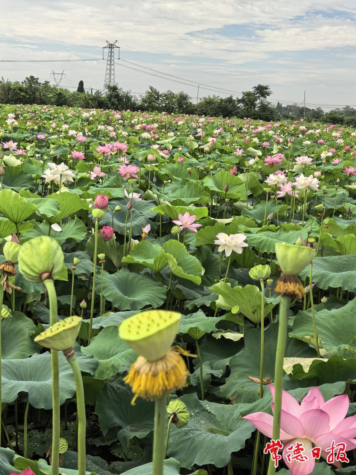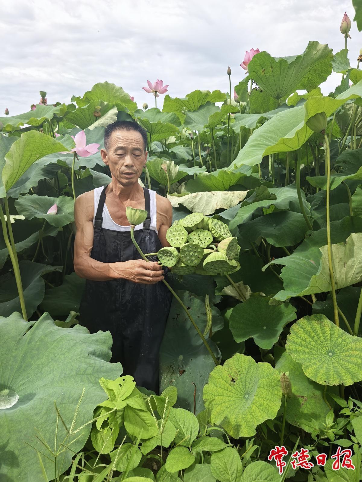6月28日上午,武陵區李白溪村7組村民盧文華電話響起:“老板,可以摘點蓮蓬嗎?”盧文華拿起下水褲快步走到荷田邊,問清楚路人需要多少個蓮蓬后,踏進荷田深處,不到10分鐘,他從荷塘另一邊爬起來,手上拿著一束蓮蓬。蓮蓬以2元/個的價格售出,這一趟他收入50元。