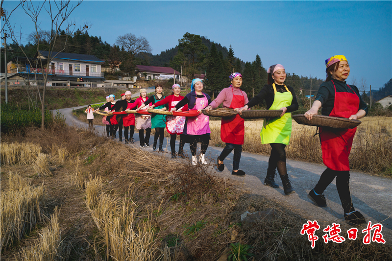 · 2020年12月25日,桃源縣茶庵鋪鎮長板鋪村的農婦端著篩盆去曬蒿子粑粑,為過年做準備。趙有強 攝