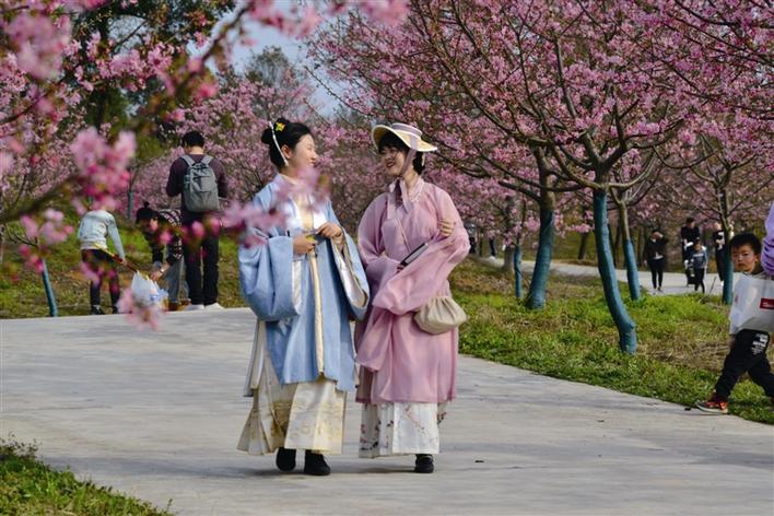 2月22日,蔡家崗櫻花園,漢服與櫻花相映成趣。 覃吉桃 攝