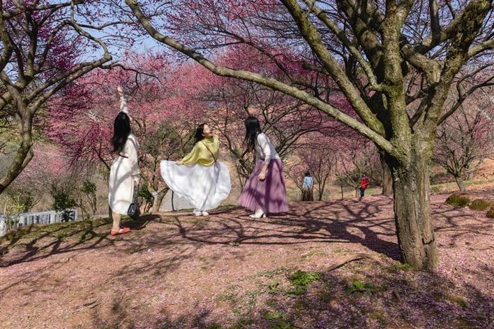 2月18日,桃源縣九溪鎮興龍村,踏春的市民在梅花下起舞。 簽約攝影師 周桂成 攝