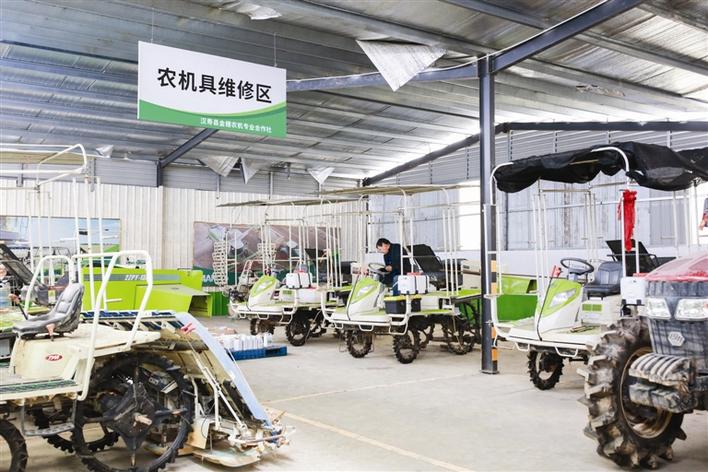 漢壽縣金穗農機專業合作社的社員在對農機進行維修和養護。本報記者 李龍 攝