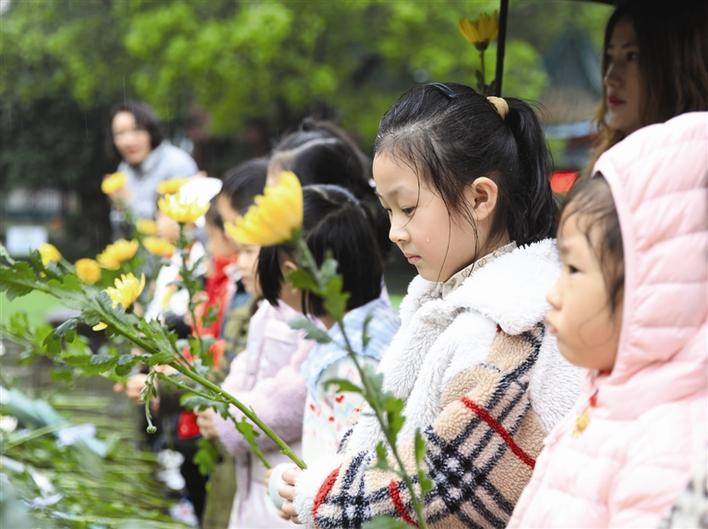 4月1日,金和嘉苑國際幼稚園的小朋友來到常德會戰抗日紀念碑,為烈士敬獻鮮花、花籃。羅蜀成 攝