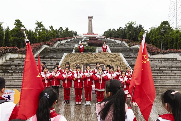 4月1日,桃源縣中小學生代表冒著細雨,在桃源烈士紀念碑前,開展“緬懷革命先烈,弘揚民族精神”系列活動。 周桂成 攝