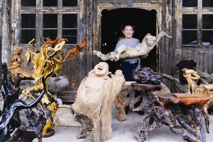 爬遍周邊山頭挖樹根,雨季在小溪撈木材。20年來,邱青山創作出木雕作品100余件,或寫意,或寫實,有神話人物、各類動物以及日用品。