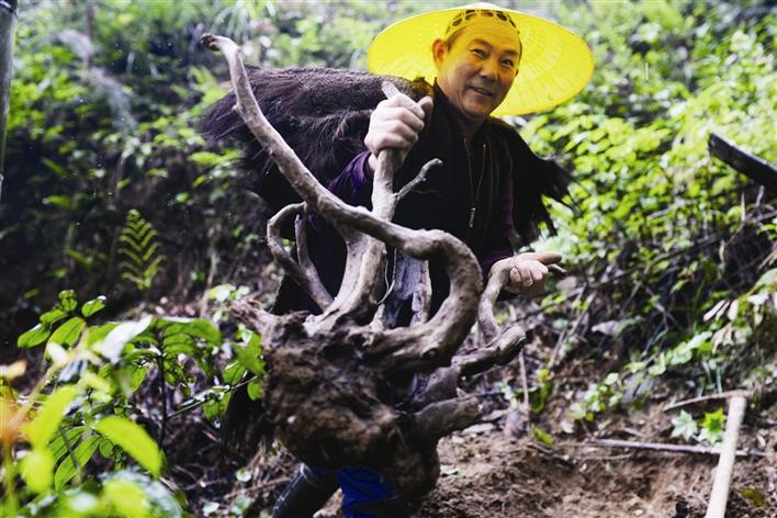 挖到合適的樹根,邱青山的臉上洋溢著喜悅。