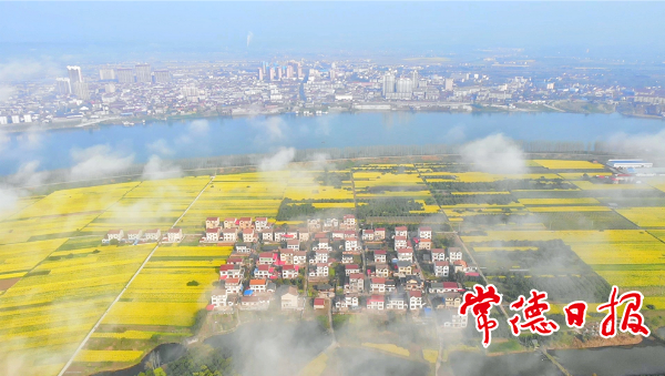 云霧掩映,陽光透過云層撒在油菜花上,生意盎然