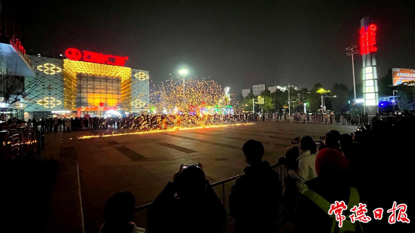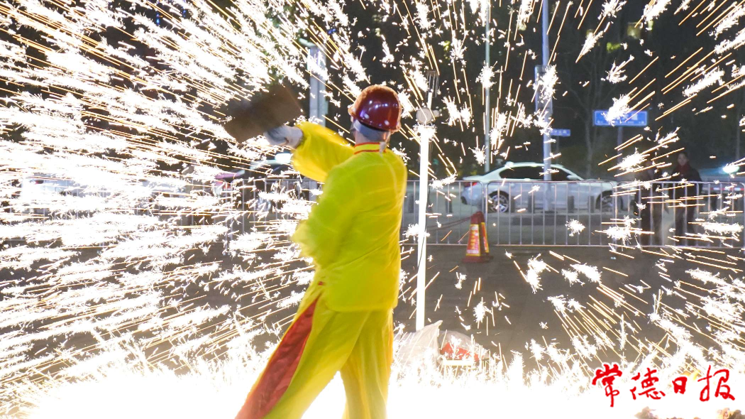 1月22日正月初一,常德武陵萬達廣場前坪舉辦“千年非遺打鐵花”活動,1500度高溫的“鐵樹”上開滿了銀花,仿佛漫天繁星,每一秒都是震撼人心的夢幻畫面。現場觀眾拿出手機拍照發圈,整場活動吸引近千人圍觀。