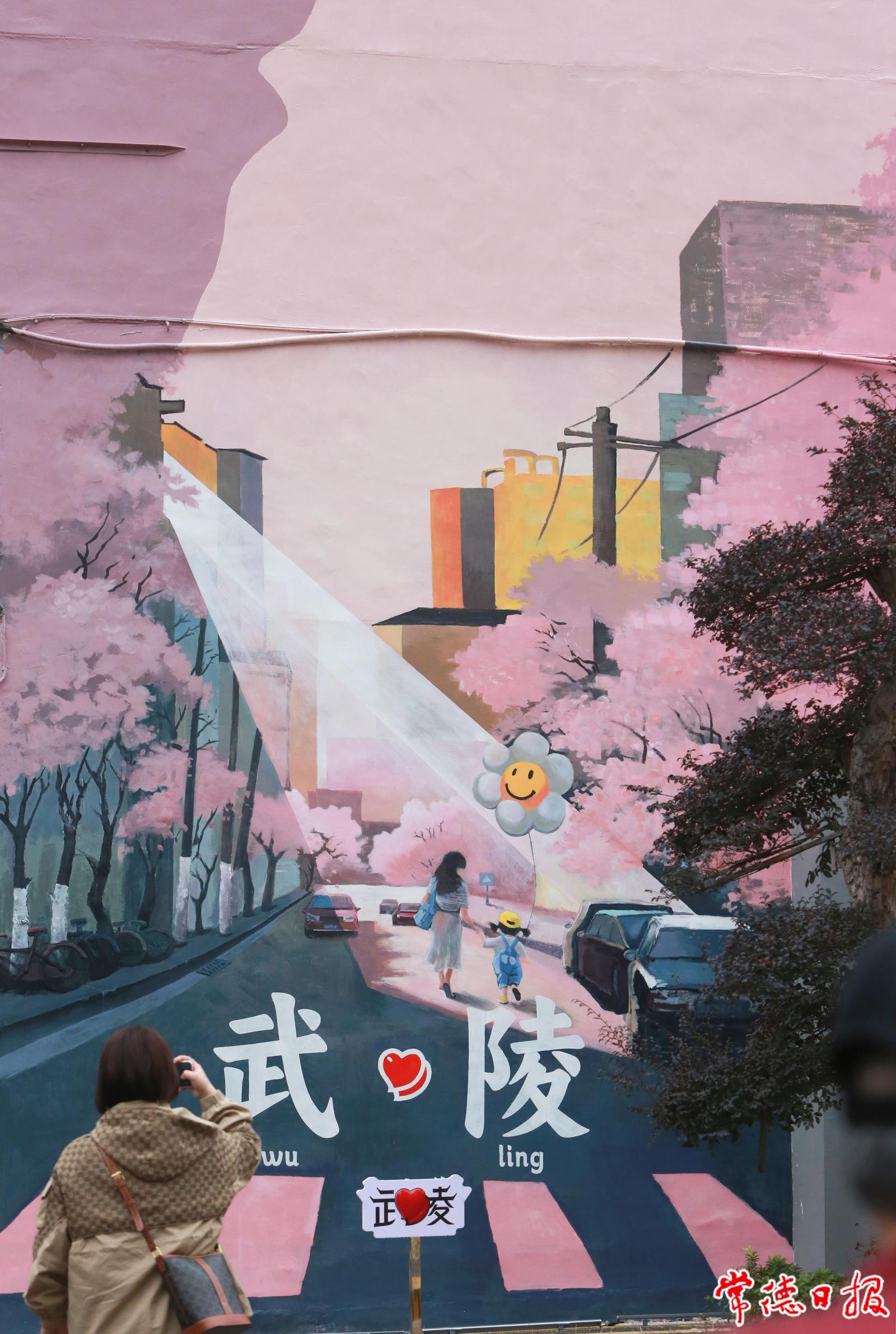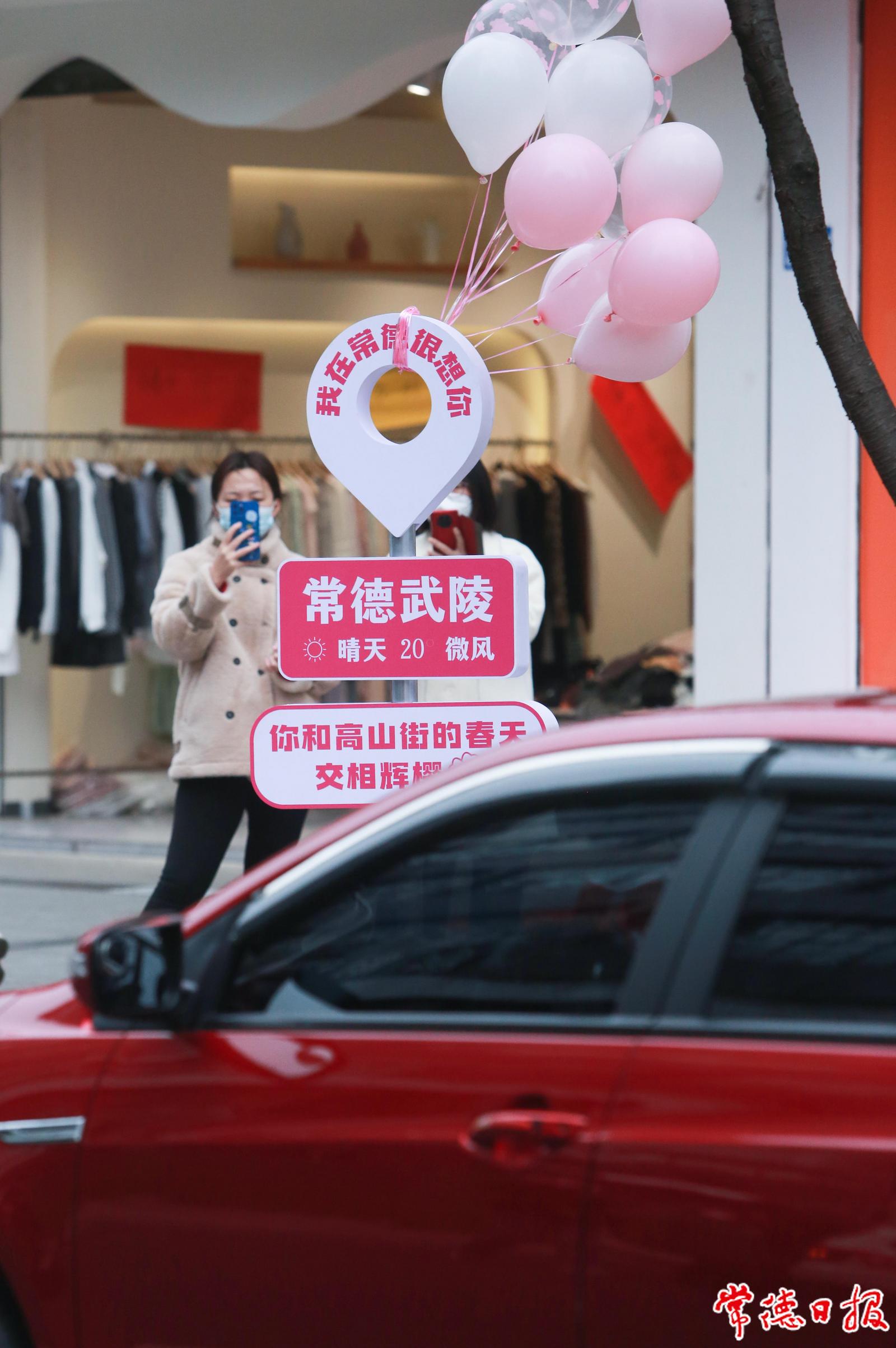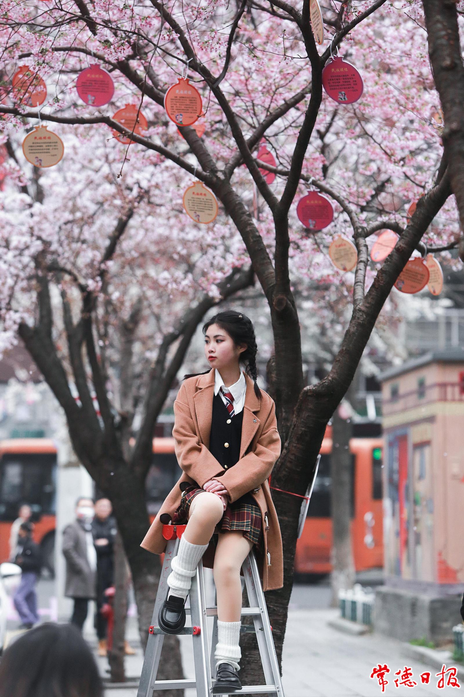 3月3日,常德市城區高山街櫻花初綻,前來賞花的市民絡繹不絕。為和櫻花來張親密的合影,有經驗的市民直接搬來了人字梯并邀請專業攝影師進行拍攝。市民賞花恰逢府坪街道舉辦的賞櫻消費季,不少極具創意的打卡標示牌被擺放在街頭,人來人往,拍照留念,好不熱鬧。