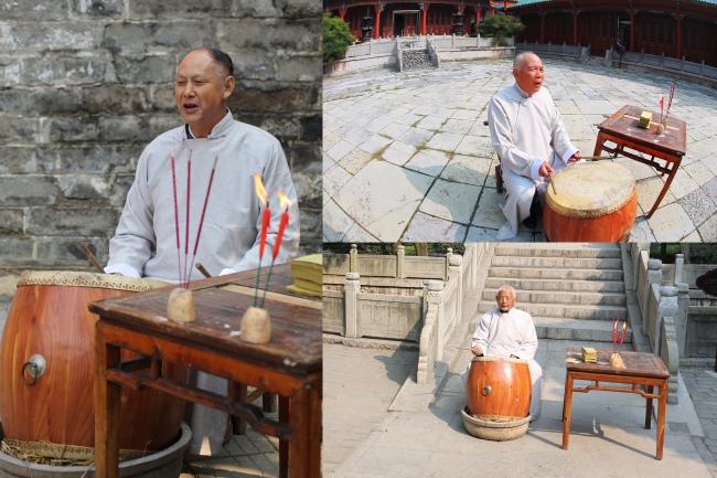 2013年9月藝人李金楚(左)劉清斌(右上)周召學(右下)在澧州文廟表演鼓盆歌