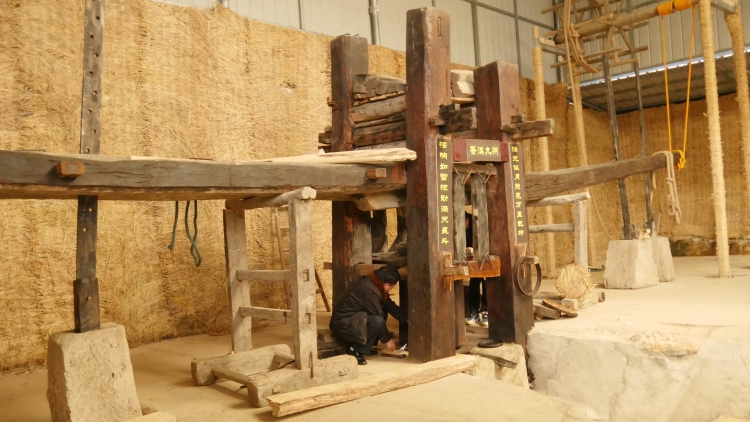 入榨,即把做好的油餅放入榨膛(邢斯瑋 拍攝)