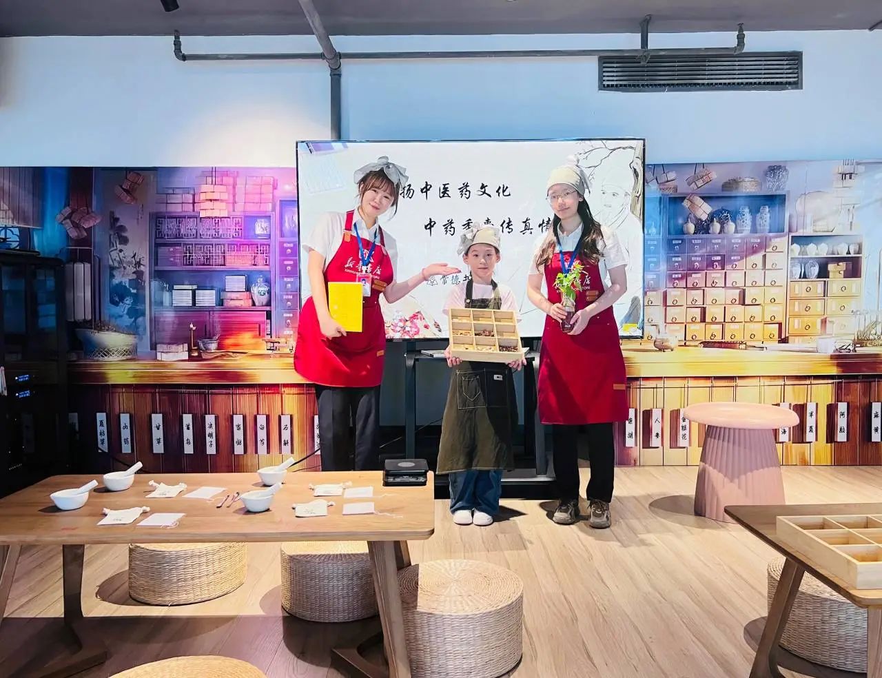 店員老師通過演示選取藥材、搗碎、稱重、裝粉等流程,手把手教學生們掌握中醫(yī)藥香囊的制作步驟以及工具的使用方法。
