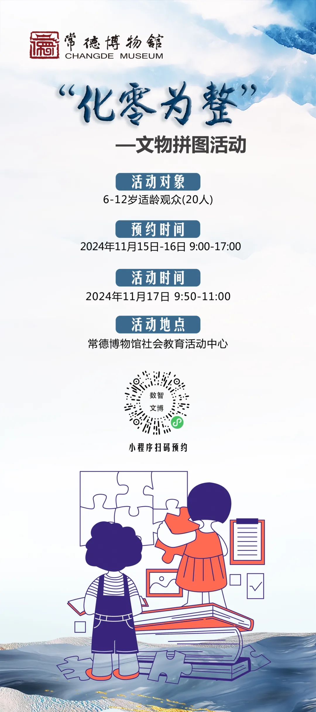 預約時間到啦!11月17日,常德博物館推出文物拼圖活動。我們為大家準備了精心設計的古代陶器、金器、青銅器等拼圖。孩子們用一雙雙巧手“化零為整”拼出文物拼圖,在與文物的“互動”中感受常德源遠流長的歷史文化,增強文物保護意識。這是記憶力與觀察力的挑戰,也是視覺與思維的雙重享受,讓我們一起來動手拼出那些跨越千年的文物“奇跡”吧!