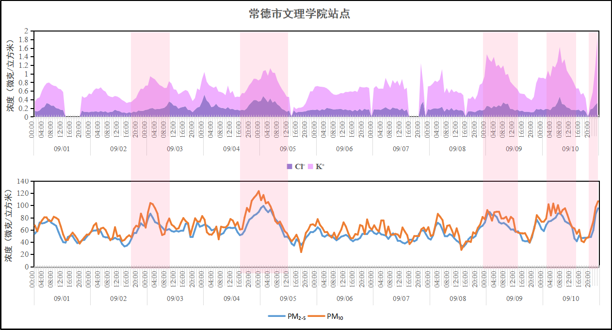 9月1—10日常德市組分站PM2.5和PM10與顆粒物中氯離子、鉀離子濃度變化圖