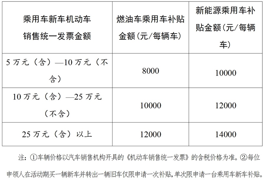 答:對報廢上述兩類舊車并購買新能源乘用車的,補貼2萬元;對報廢國三及以下排放標準燃油乘用車并購買2.0升及以下排量燃油乘用車的,補貼1.5萬元。
